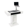 The GROOVE TERMINAL is a premium DJ booth for modern mobile professionals. Offering a clean, functional setup for weddings and cor¬porate events, while also doubling as stylish furniture for bars, clubs, or home studios. Designed with real-world workflow in mind, the control platform, centre pillar shelves, and control cover all fea¬ture pre-drilled cable holes for tidy cable routing- allowing power and audio lines to pass discreetly from your controller down to the base plate, keeping your setup clean and clutter-free. Built for both mobility and durability, the GROOVE TERMINAL breaks down easily, travels securely, and reassembles quickly, making it the ideal solution for mobile DJs who demand performance and presentation in one package.